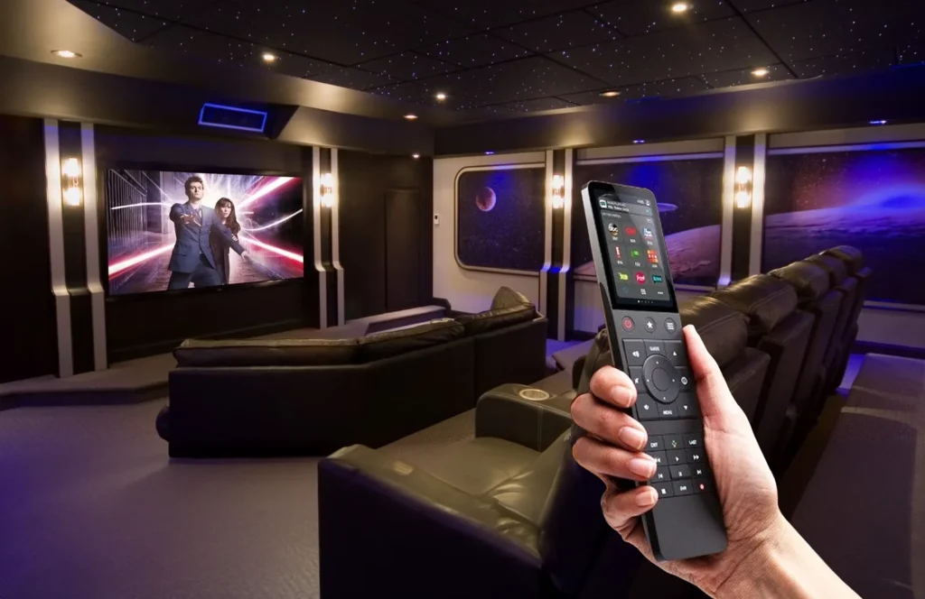 Manage your entire home theater with a single remote or app, controlling lighting, projector, screen, and sound systems for your perfect movie night.